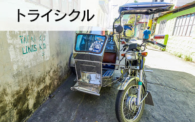 オートバイにサイドカーをつけた三輪の乗り物です。ジプニーなどが入れない住宅街などでよく見かけます。