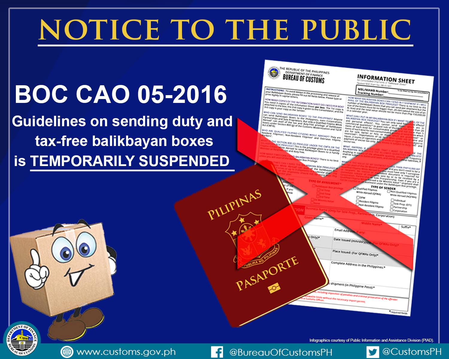 The submission of the documentary requirements such as Information Sheet, photocopy of the Philippine passport, invoice or proof of purchase of the goods contained in the balikbayan box is suspended until March 31, 2018.